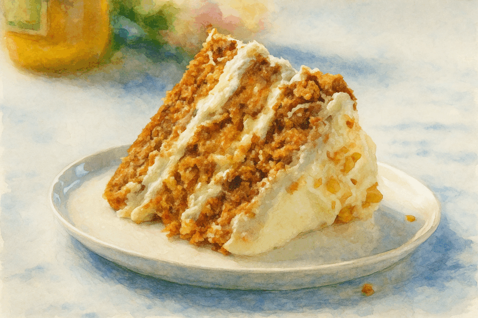 On beurre un moule, on verse la préparation et on laisse cuire cinquante minutes. La croûte dore, le cœur gonfle lentement, la maison s’emplit d’une odeur de beurre, d’épices et de sucre. À la sortie du four, il faut attendre : un carrot cake se mérite. On le laisse refroidir avant de démouler, pour que sa texture se stabilise, moelleuse sans être humide.